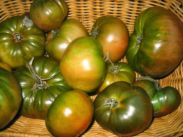 The tomato crop this year was unbelievable! We harvested more than 200 tomatoes and Tom made a roasted tomato salsa for himself that was great, too. I also cooked tomatoes with garden onions and peppers, then pureed them and stuck them in the freezer to use for a variety of soups this winter. I'm thinking a pureed black bean and tomato soup might be delish! I'll experiment on that and get back to you. As you can see from the photos below, we had an abundance of tomatoes. Tom chose all heirloom seeds and had about 10 varieties. Nope, they aren't as pretty as store-purchased tomatoes, but the flavor can't be beat! And remember the information I posted by Barry Estabrook about "Tomatoland". Disgusting on many levels.
